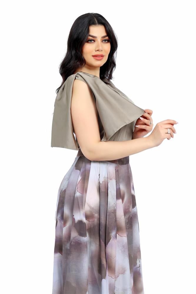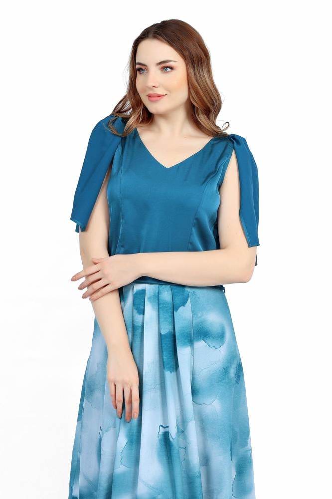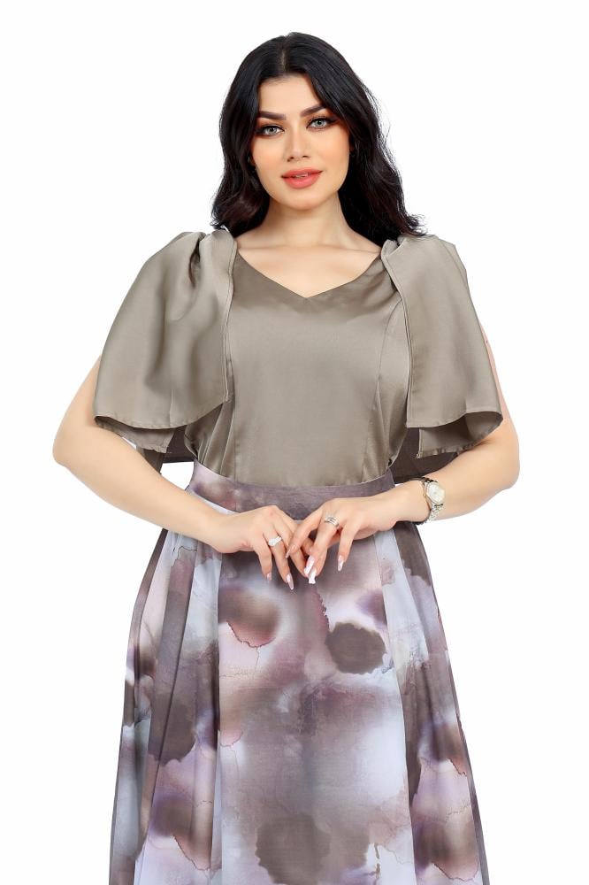 بلوزة أليزا بتصميم سادة بقصة مثلث وأكتاف مكشوفة ، حيث يتميز التصميم بأناقة كلاسيكية تلائم المناسبات المختلفة.