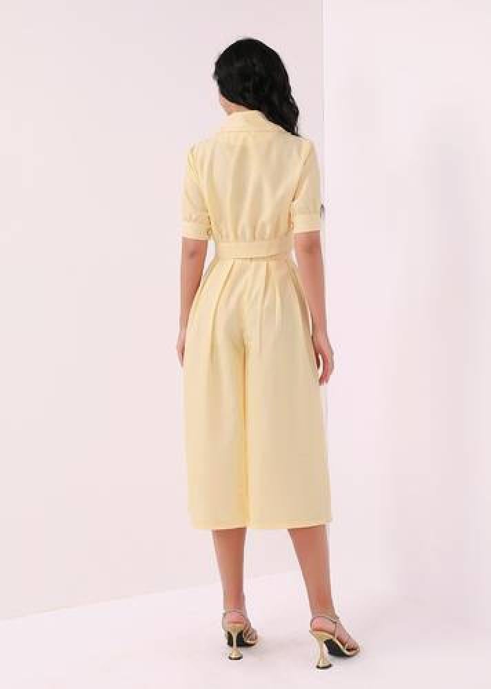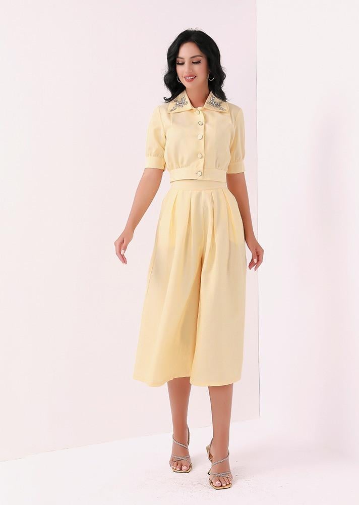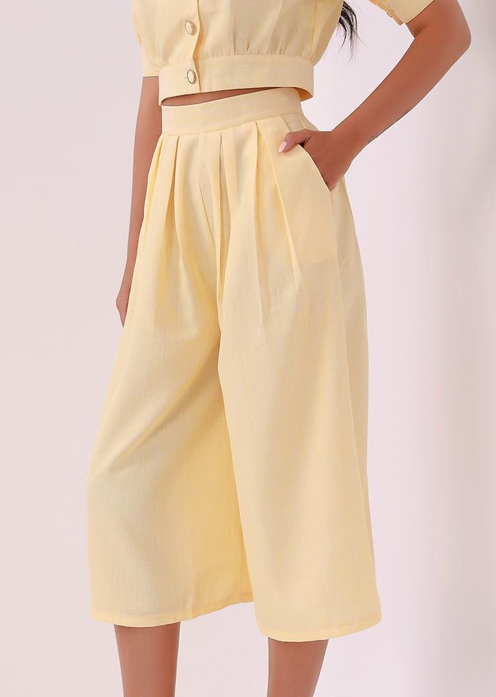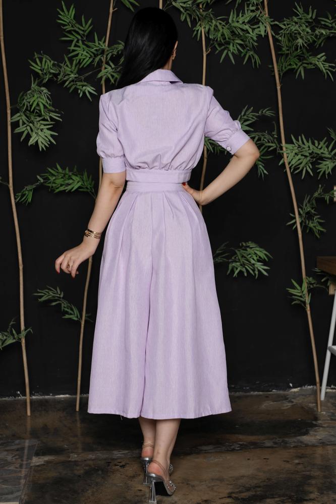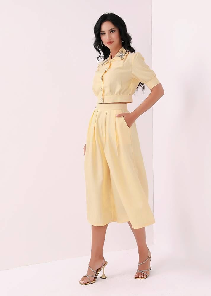 بنطلون سادة واسع الساقين مع جيوب جانبية ضيقة وقصة انسيابية ملفوفة حول الخصر، استكملي أناقة مظهرك مع بنطلون عصري أنيق يلائم تصميمات البلايز المختلفة ومناسب للأجواء الربيعية والصيفية.