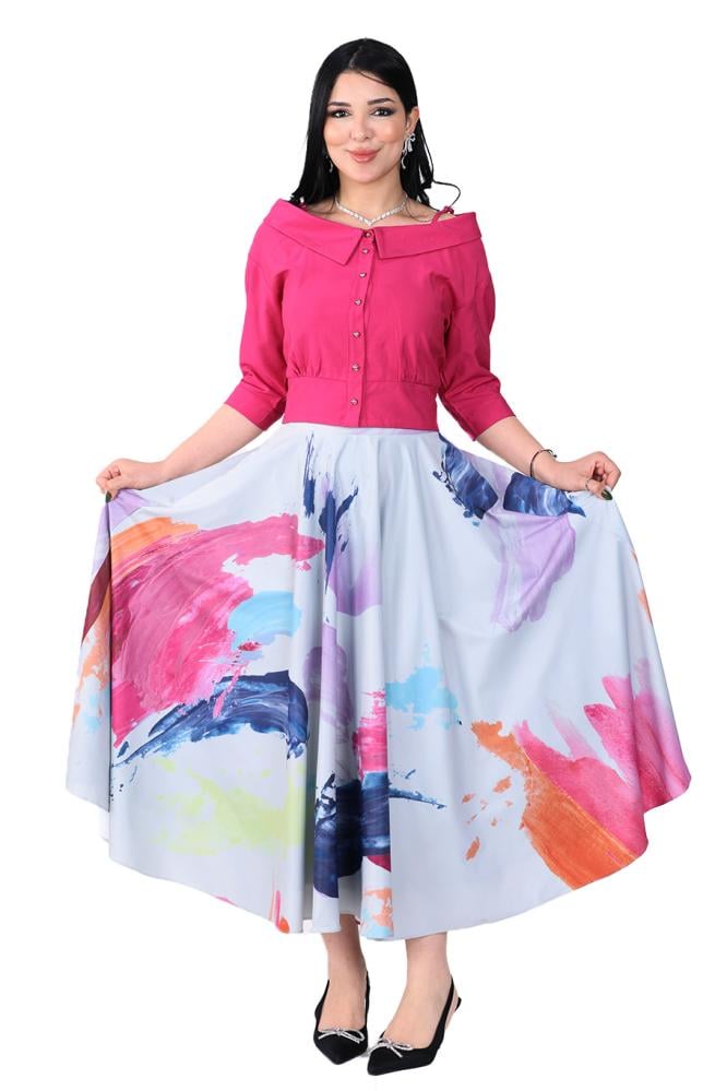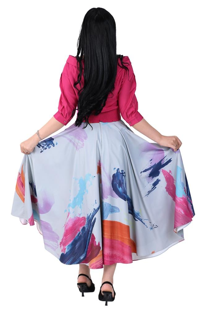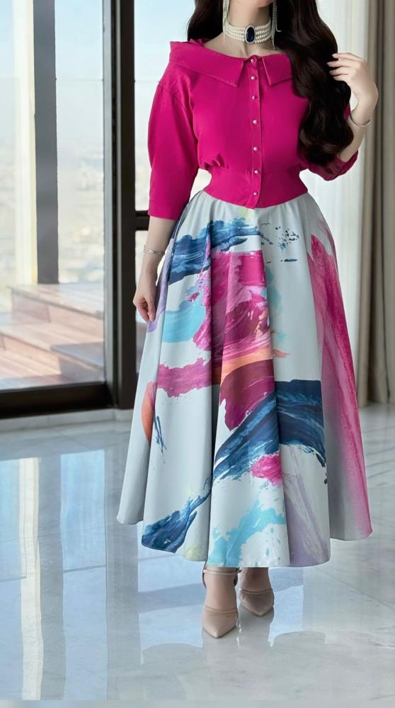 التصميم : تنورة بطبعات بتصميم واسع منفوش.