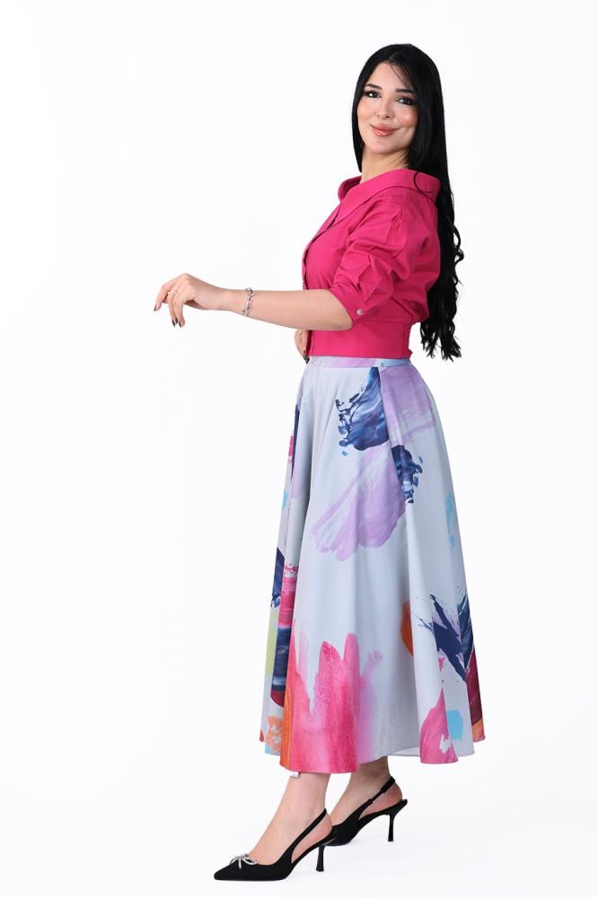 تنورة كسرات بتصميم واسع ومنفوش، مزينة بطبعات رائعة تعطيها لمسة أنيقة وعصرية. القماش خفيف و مريح، يناسب كل الأوقات والمناسبات.