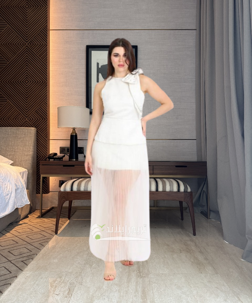 فستان ابيض تل ولمسة فيونكة على الكتف، تصميم أنثوي فخم يضيف لك جاذبية وأناقة، مثالي للمناسبات لإطلالة راقية .