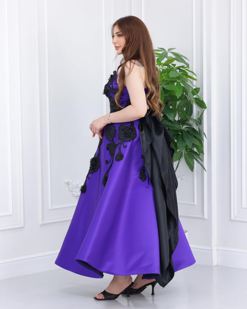 فستان بورود مزين بـ تطريزات على شكل زهور مع طيات التي تمتد على الأكتاف تضيف مظهرًا مميزًا وعصريًا، وتزيد من تأثير الأناقة في التصميم.