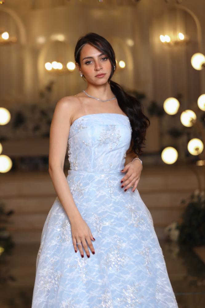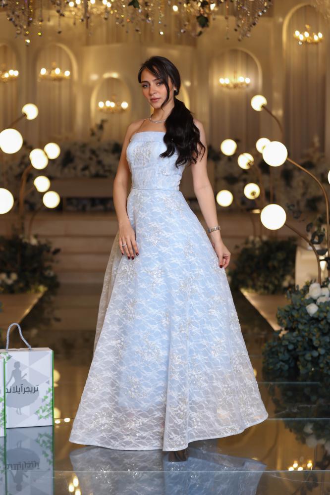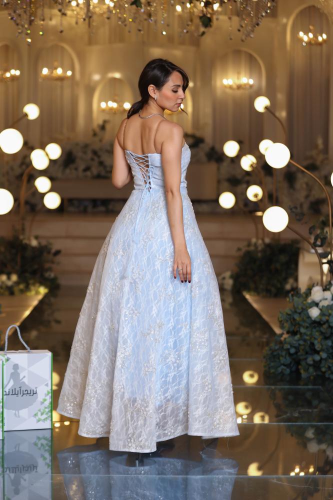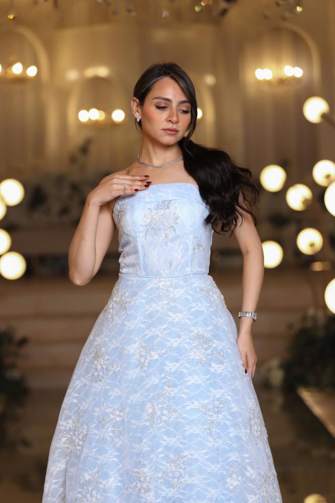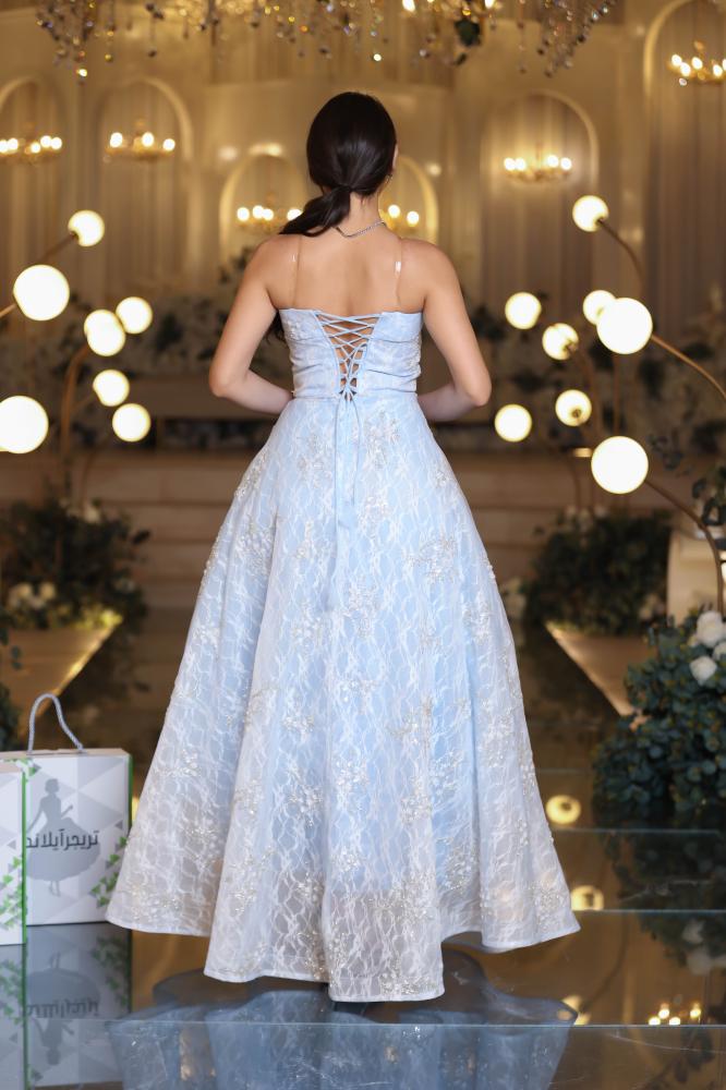 تألقي بإطلالة رومانسية راقية مع فستان سهرة من الدانتيل المطرز يجمع بين النعومة والفخامة في تصميم واحد. اللون السماوي الهادئ يمنحك حضورًا أنثويًا ناعمًا يناسب المناسبات الخاصة والسهرات الراقية.
