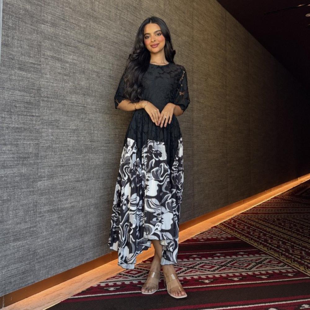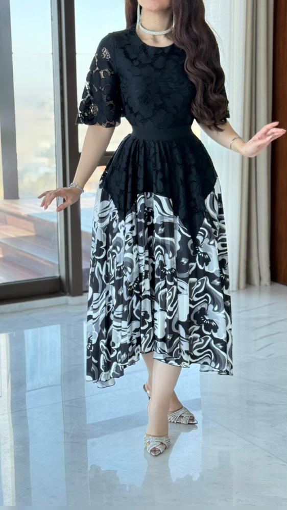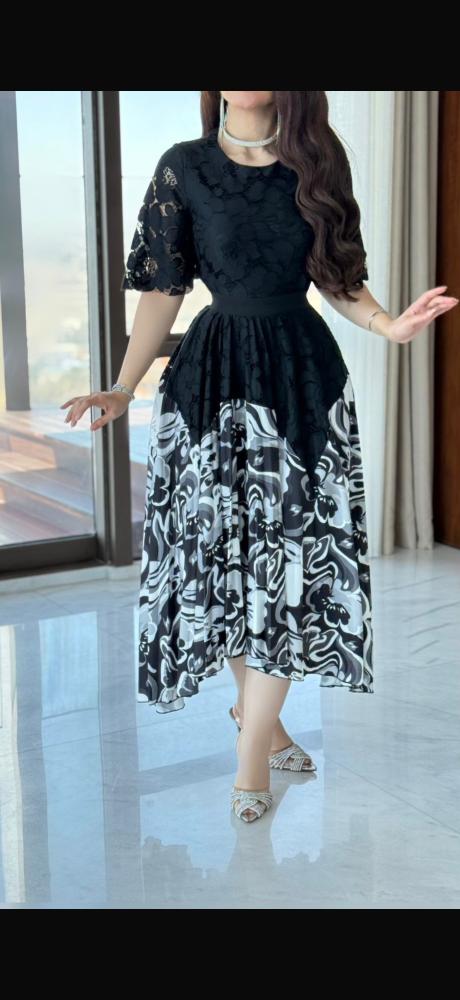 فستان دانتيل اسود أنيق من قماش الدانتيل، مشجّر بنقشة ناعمة تعطيه طابع أنثوي، وجاي بكسرات بليسيه من الأسفل تضيف حركة ولمسة ناعمة .