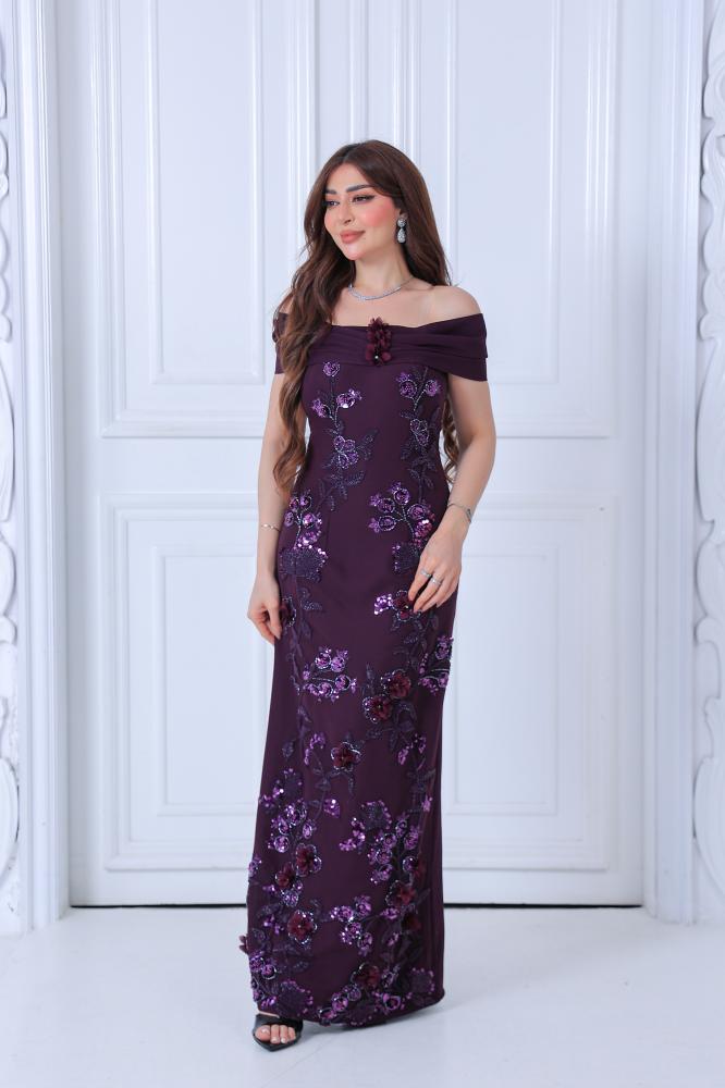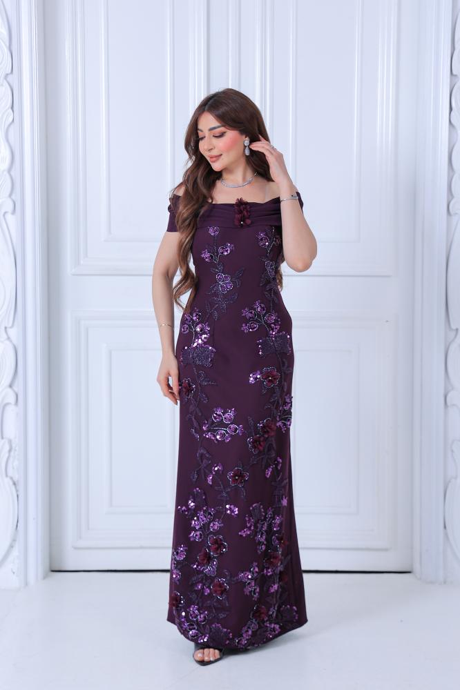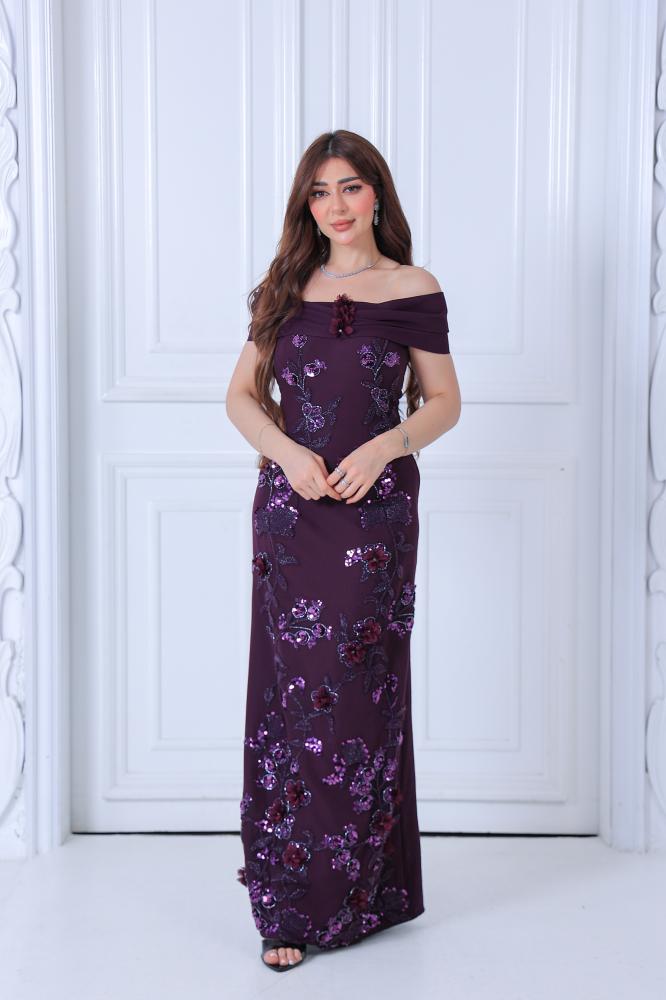 فستان سهرة بنفسجي أنيق بتصميم أوف شولدر، مزين بتطريزات وردية فاخرة تضيف لمسة أنثوية ناعمة. مثالي لسهراتك بأسلوب سعودي راقٍ وجذاب.