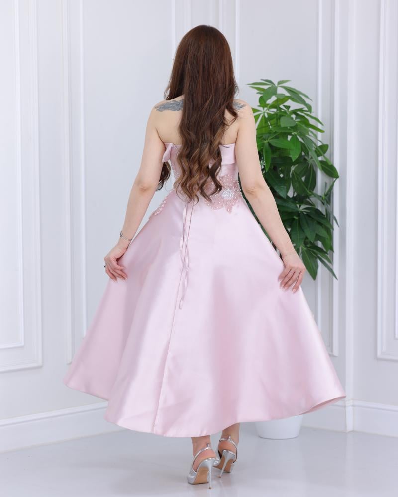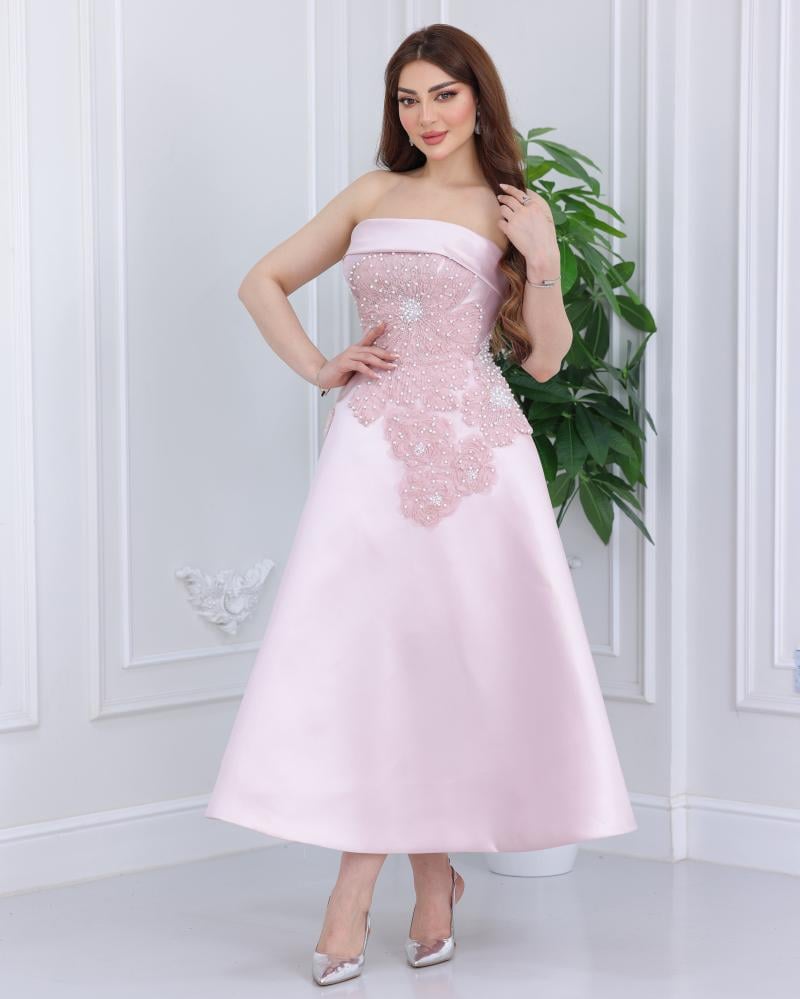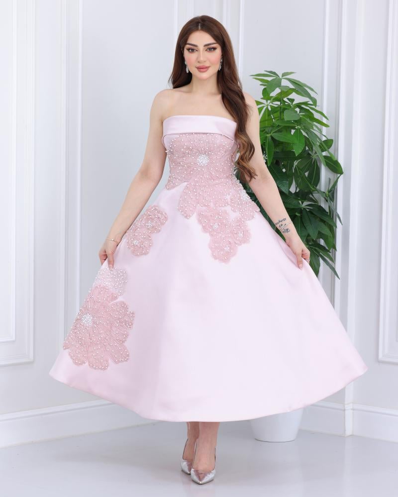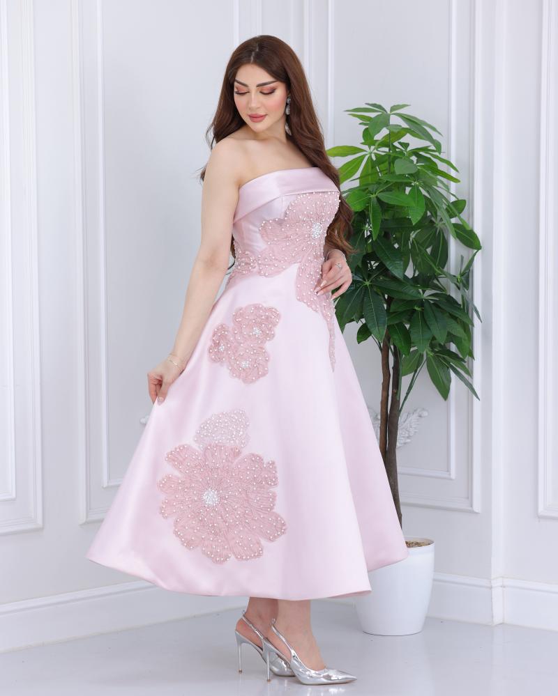 فستان سهرة زهري الذي يعكس لمسة من الرقة والنعومة ويمنح الفستان طلة أنثوية رائعة الجزء العلوي مزين بتطريزات من اللؤلؤ والكريستال .