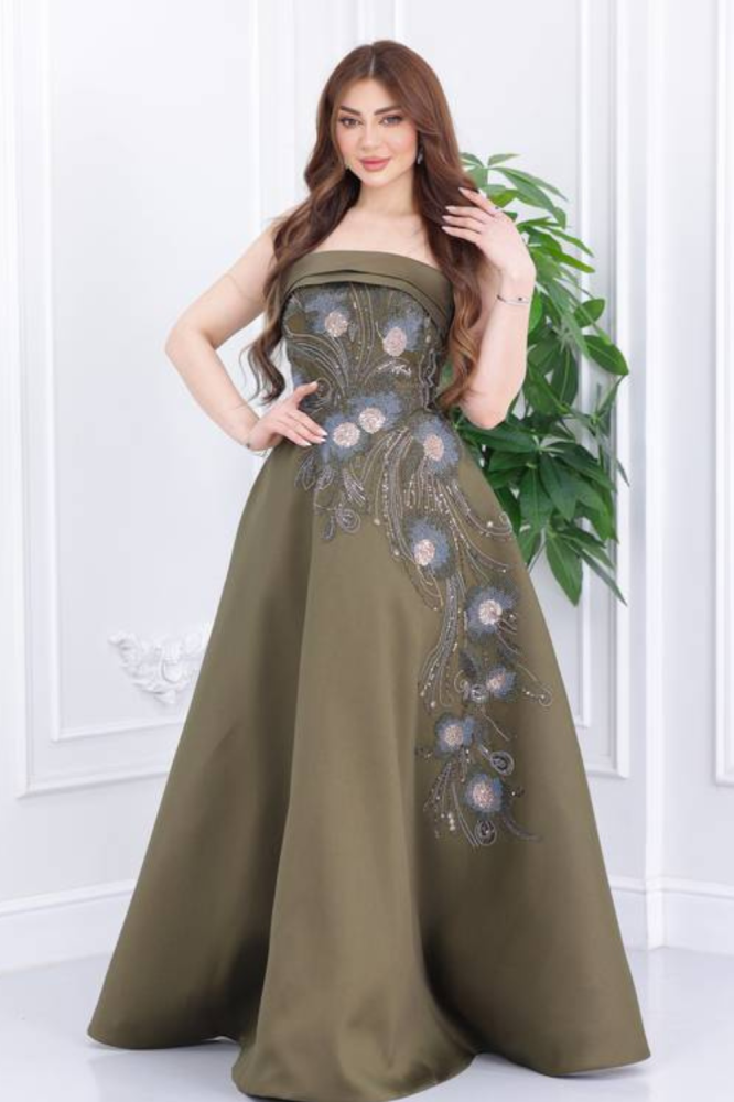 فستان سهرة زيتي الرايق، يعطيك طلة ناعمة وأنثوية بلمسة فخمة. تصميمه بسيط وأنيق، بتصميم بدون أكمام مع قصّة ضيقة تناسب الجسم.