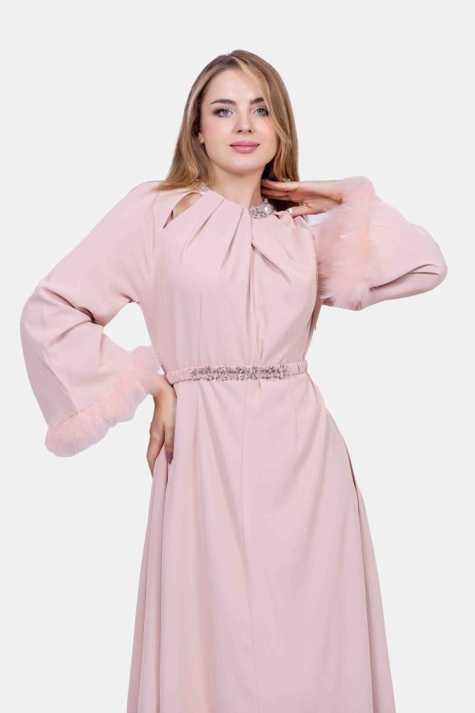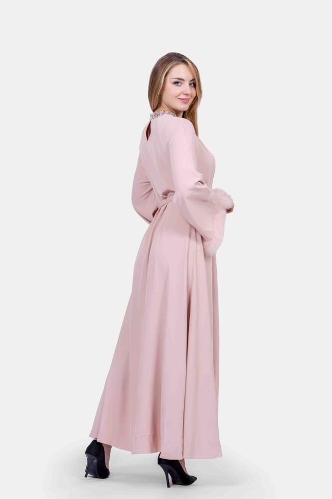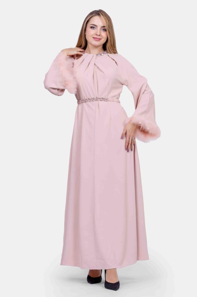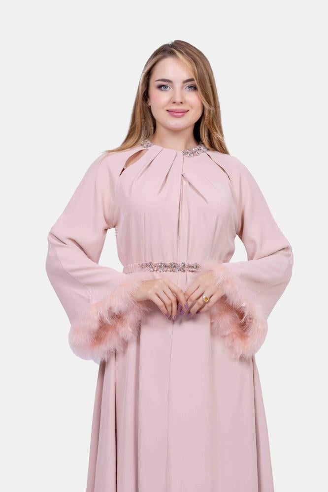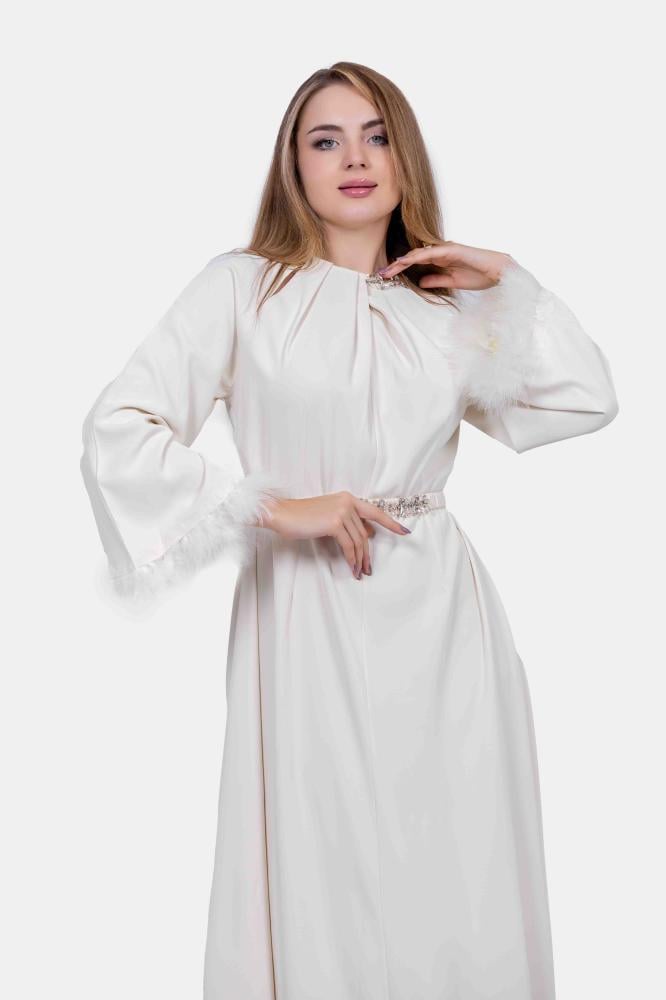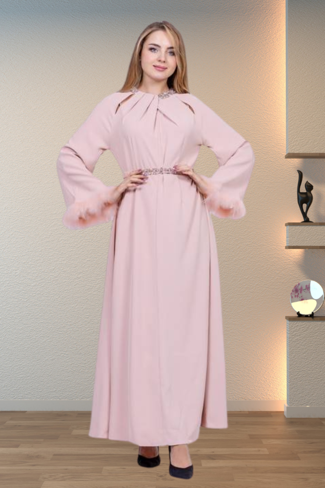 لمسة من الفخامة إلى خزانة ملابسك مع هذا الفستان الطويل الناعم الذي يتميز بأكمام مزينة بالريش الجذاب. يجمع الفستان بين الأناقة والعصرية، مما يجعله الخيار المثالي لمناسباتك الخاصة.