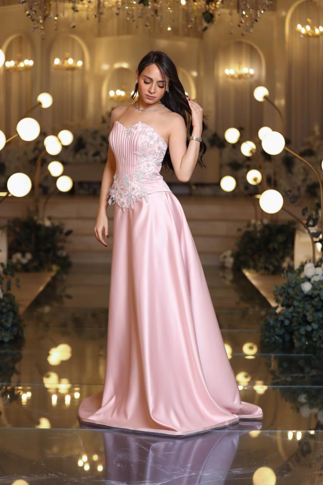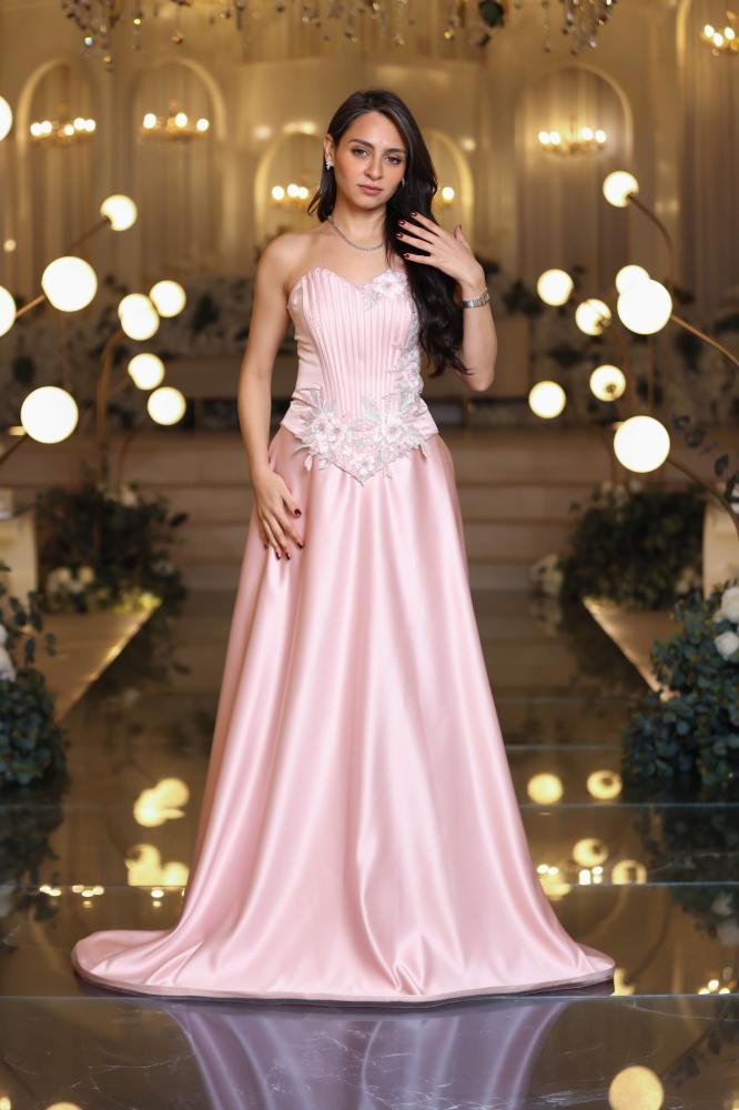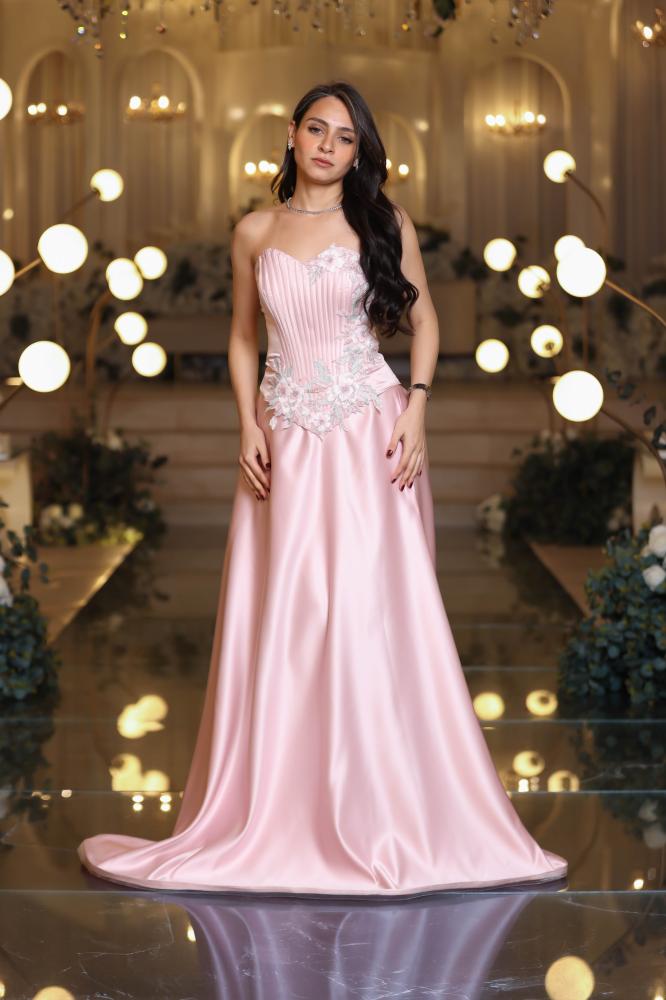 تألقي بإطلالة حالمة مع فستان سهرة تفته سفانة باللون الوردي الذي يعكس الأنوثة والرقي في كل حركة. تصميم فاخر يجمع بين الانسيابية والفخامة ليمنحك حضورًا ساحرًا في المناسبات الخاصة.