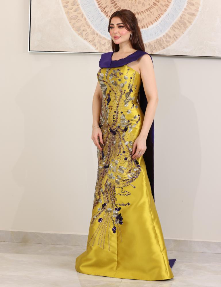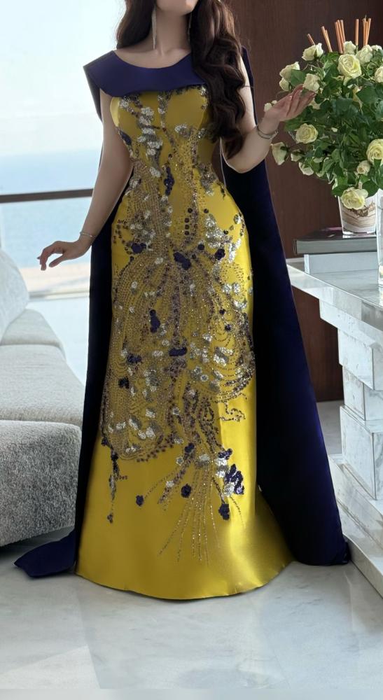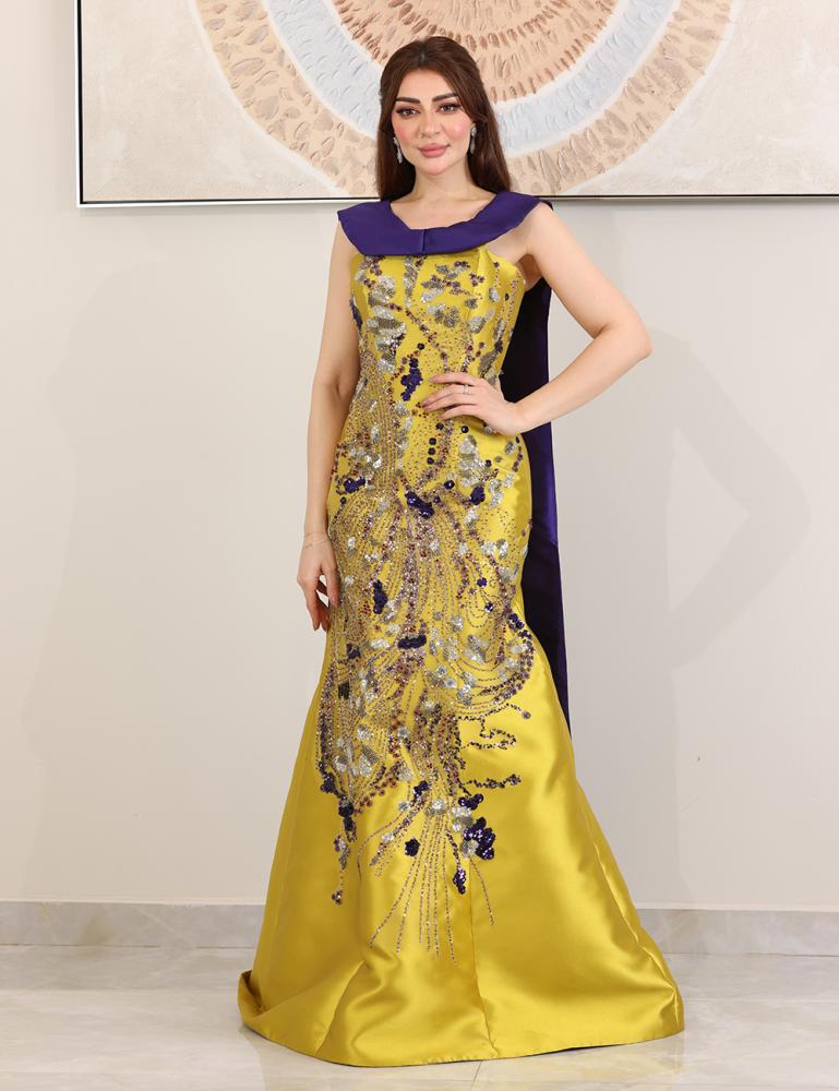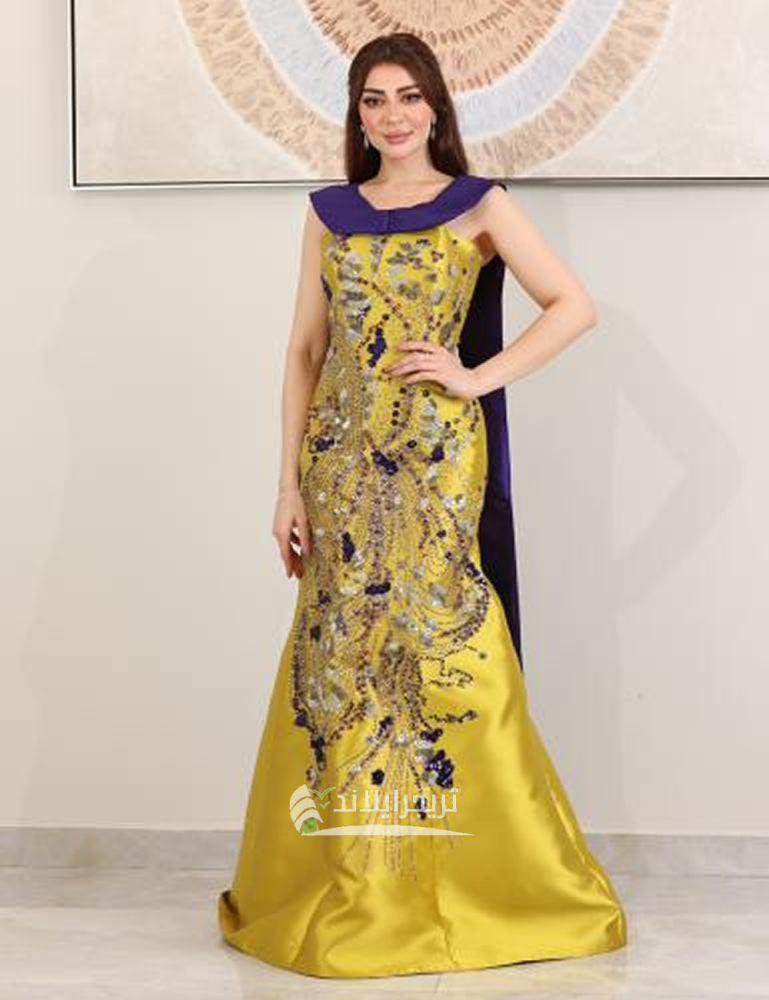 فستان سواريه لونين اصفر وموف بتصميم أنيق ولافت، يجمع بين الألوان الحيوية واللمسة الفاخرة، مثالي للمناسبات ويمنحك حضور