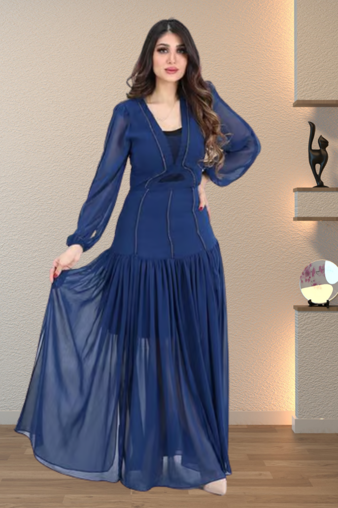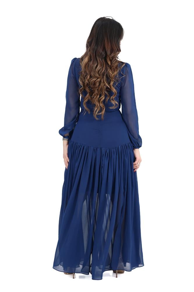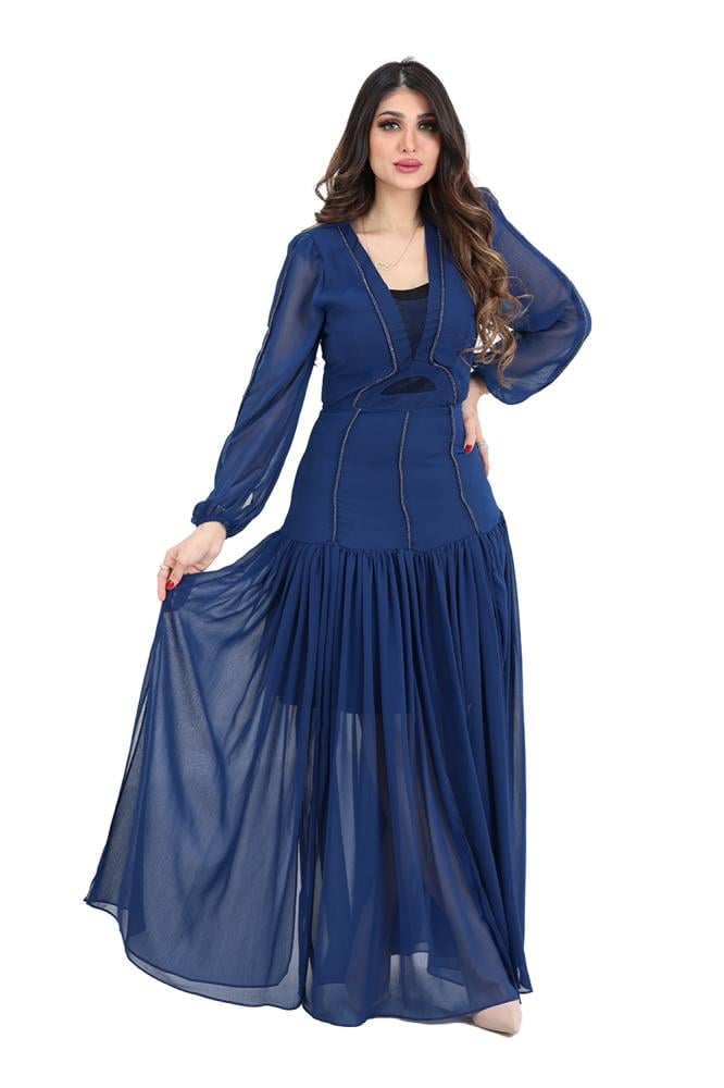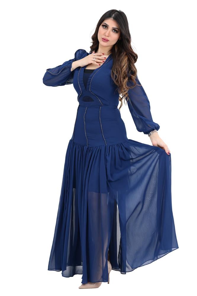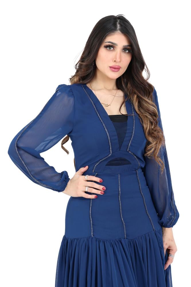 فستان شيفون كحلي أنيق بخامة خفيفة وناعمة على البشرة، جاي بقصّة مميزة مع فتحة عصرية عند البطن تضيف لمسة جرأة وجمال لإطلالتك.