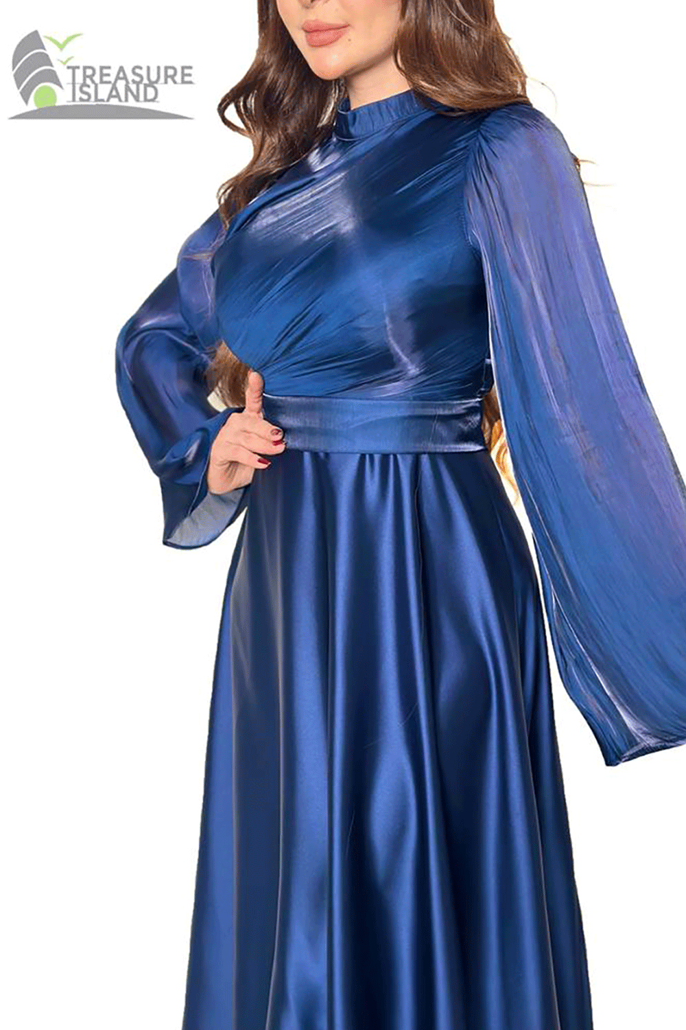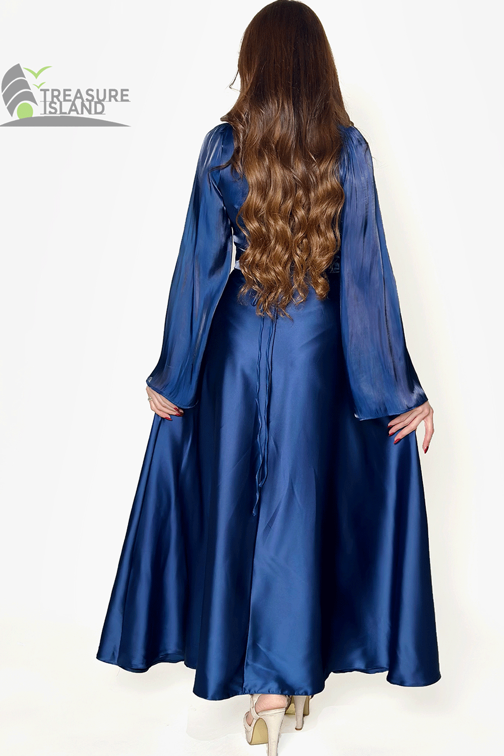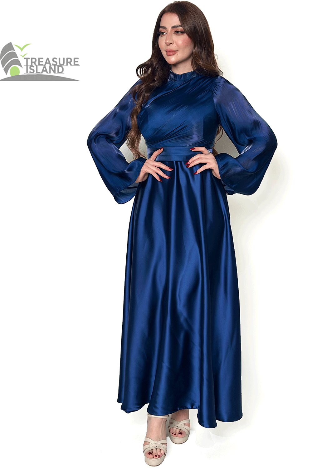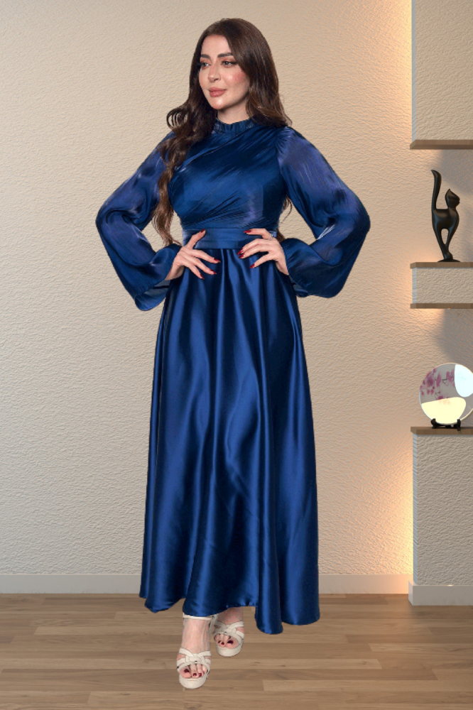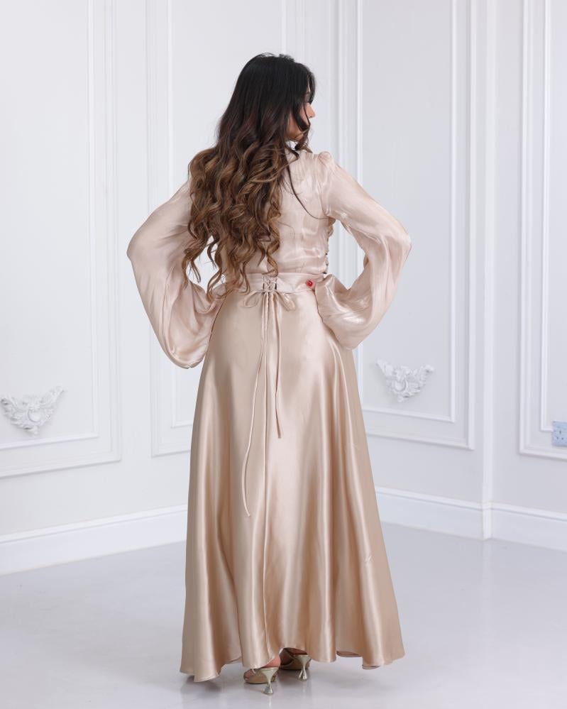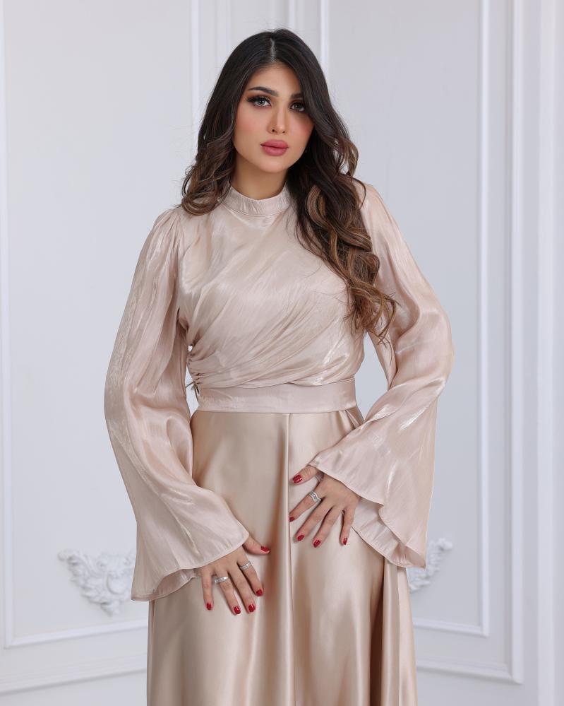 فستان طويل ستان بكسرات طويل ستان بكسرات من الاعلى وقصة بسيطة تنسدل من بشكل انسيابي واكمام طويلة فضفاضة وحزام عريض من نفس اللون يساعد على إبراز الخصر بشكل أنثوي