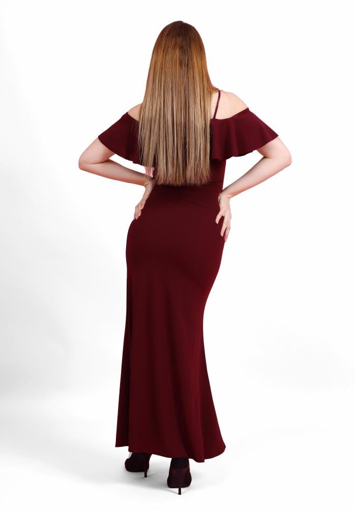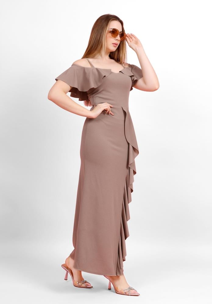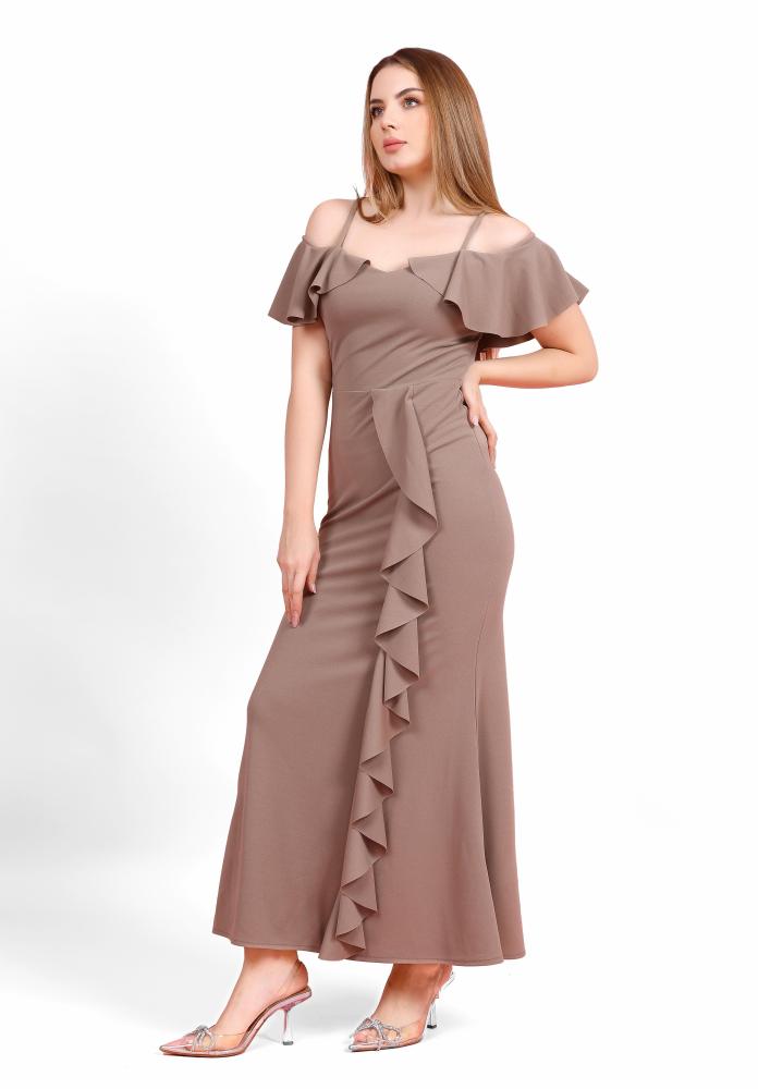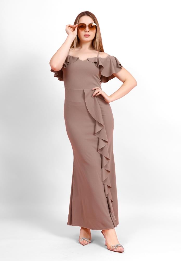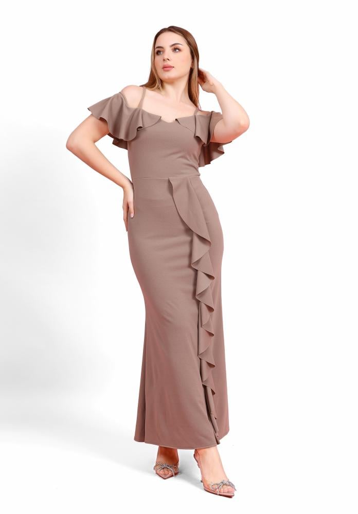 فستان ساتان ناعم وطويل من قماش الكريب الفاخر، جاي بقصة ماسكة تبرز القوام بشكل أنثوي وأنيق. الأكمام أوف شولدر تضيف لمسة دلع ورقي