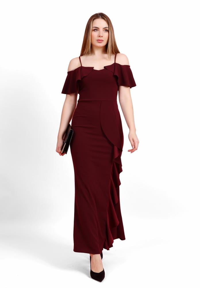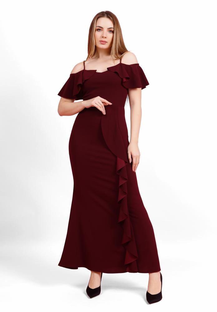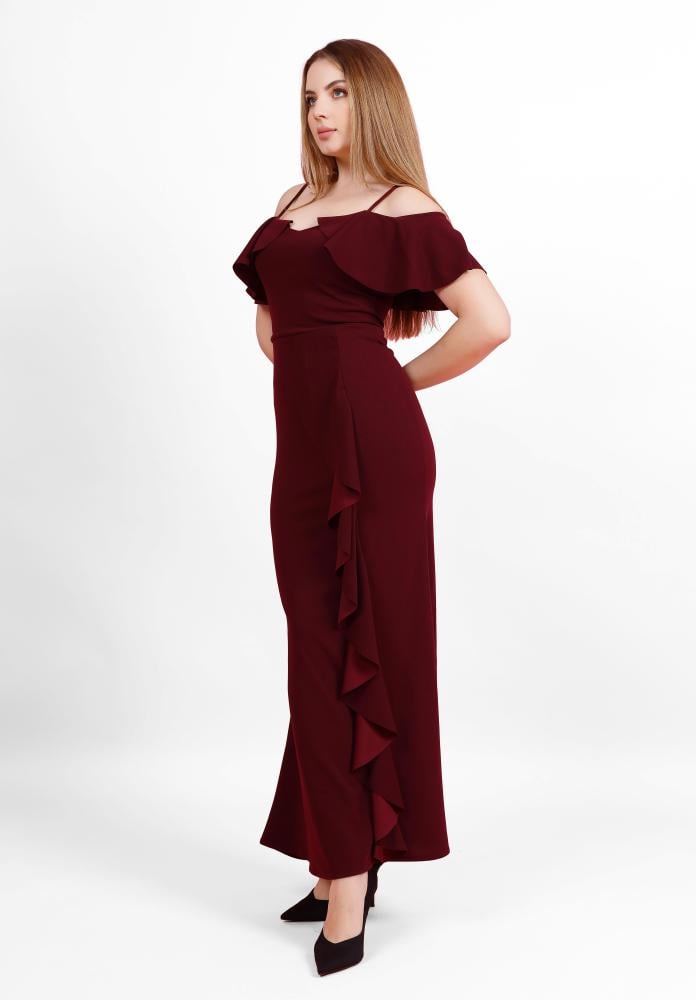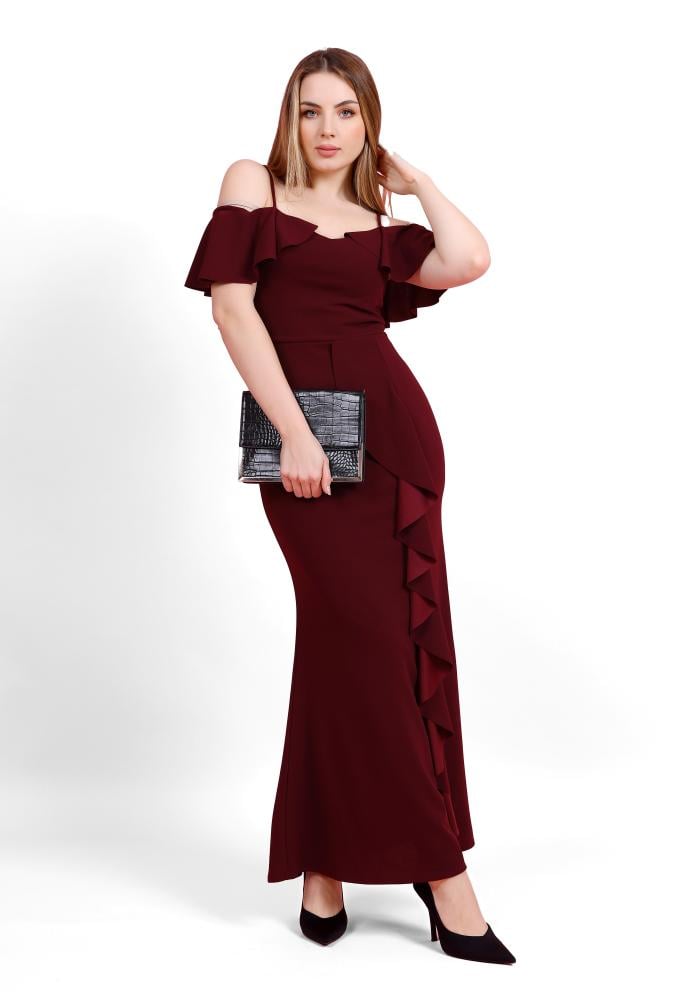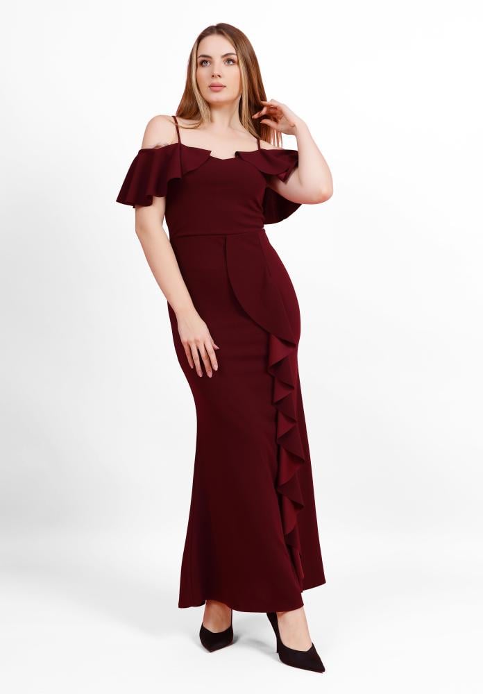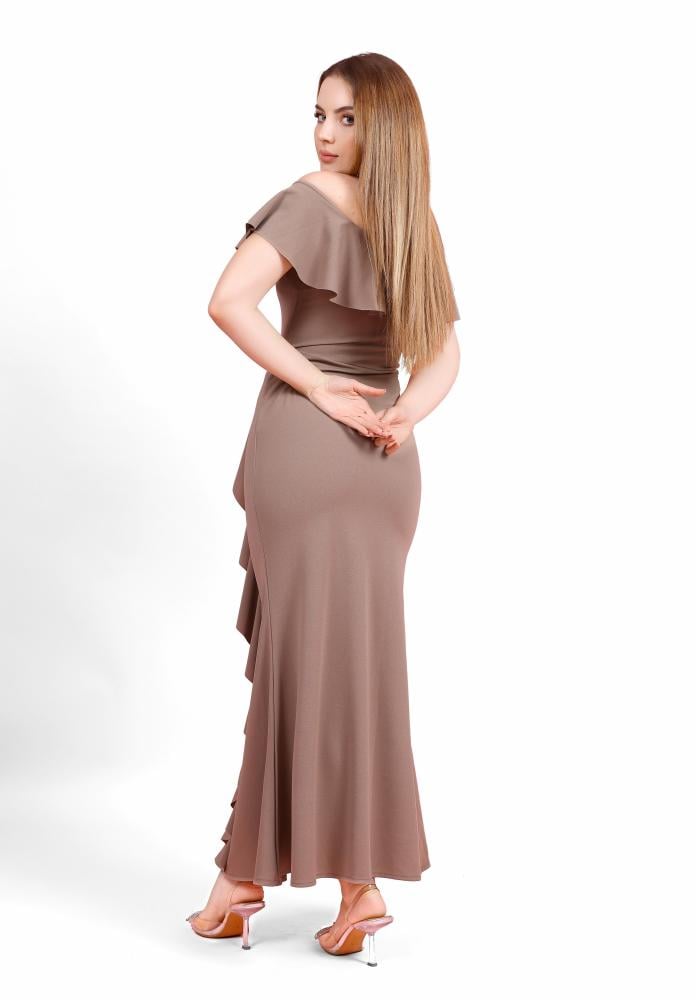 فستان ساتان ناعم وطويل من قماش الكريب الفاخر، جاي بقصة ماسكة تبرز القوام بشكل أنثوي وأنيق. الأكمام أوف شولدر تضيف لمسة دلع ورقي