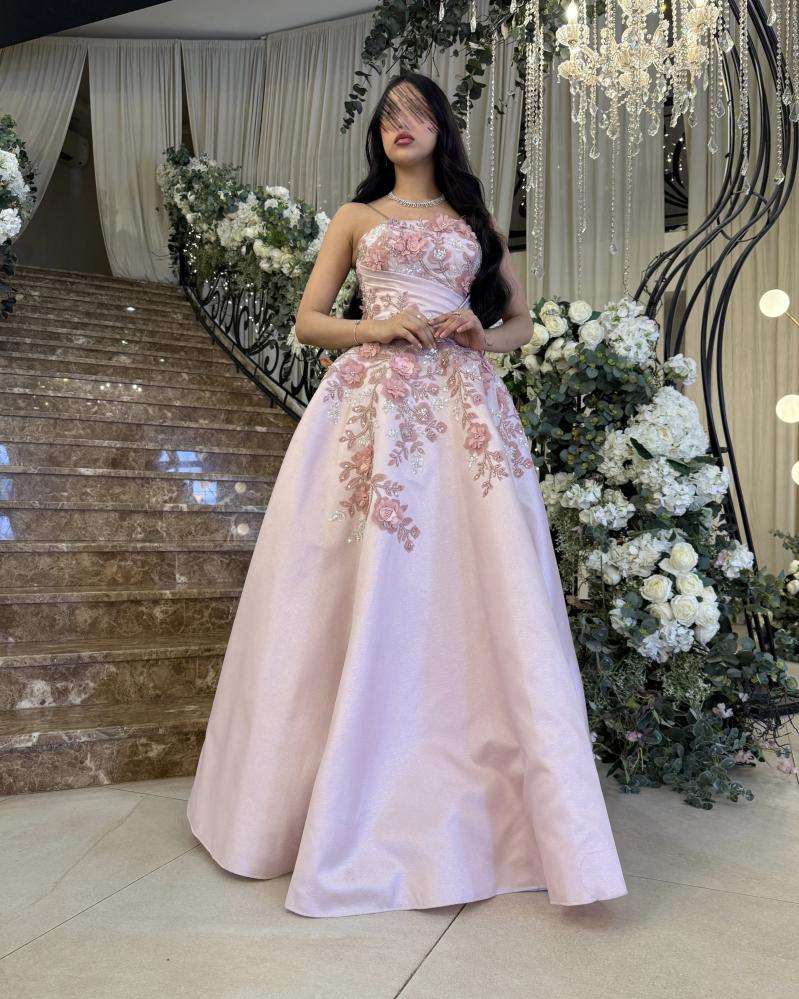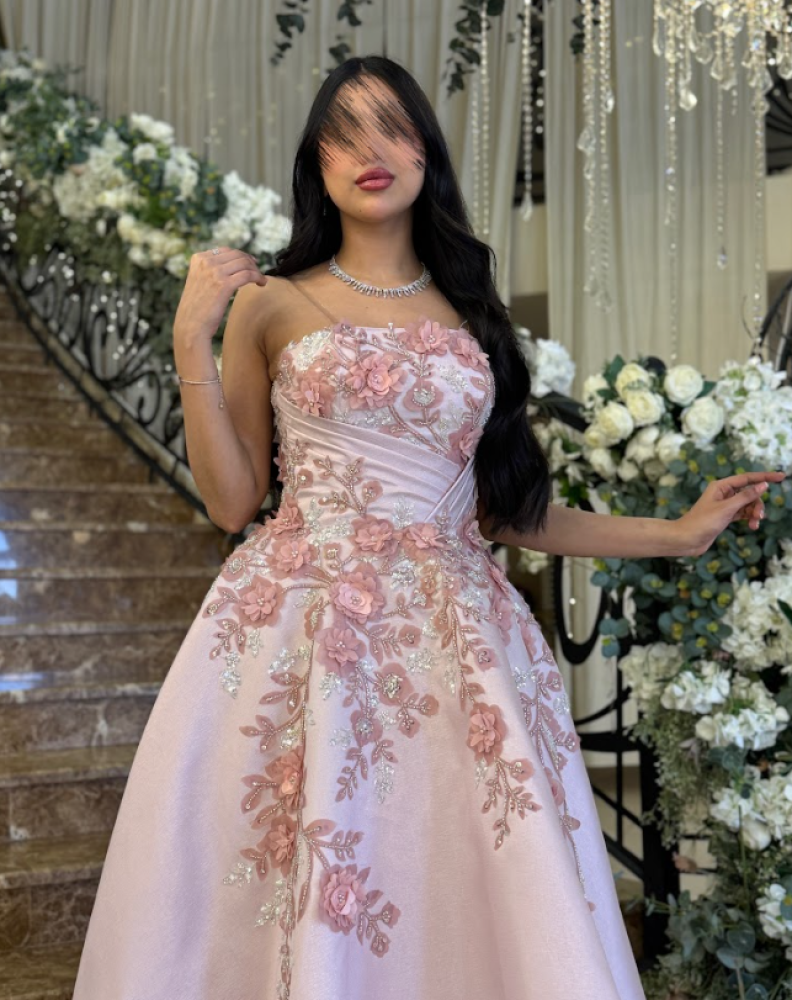فستان كورسيه أنيق من خامة الميكادو بلون وردي فاتح بتصميم منفوش، مزين بتطريزات ناعمة وورود بارزة ثلاثية الأبعاد بألوان وردية وذهبية تضيف لمسة أنثوية وفخمة. الستايل ملكي مثالى لي للمناسبات الفاخرة.