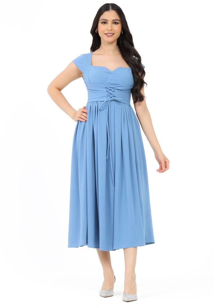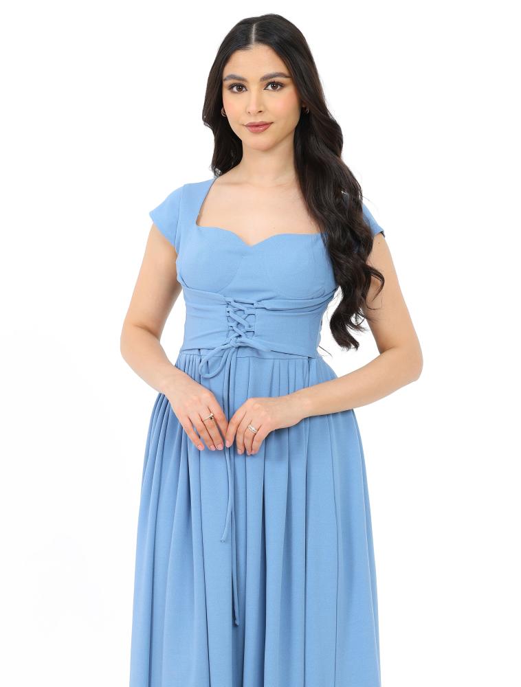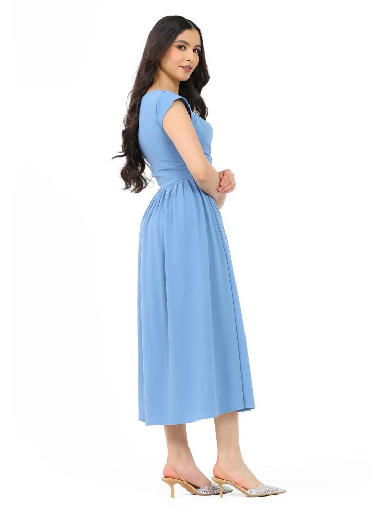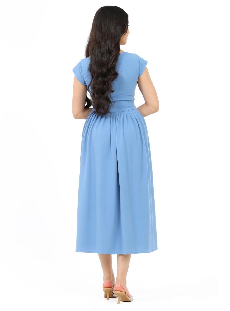 فستان ناعم يصل إلى منتصف الساق. يتميز بأكمام قصيرة وياقة مستديرة، مما يوفر الراحة والأناقة في نفس الوقت. الفستان يحتوي على حزام في الوسط لإبراز الخصر