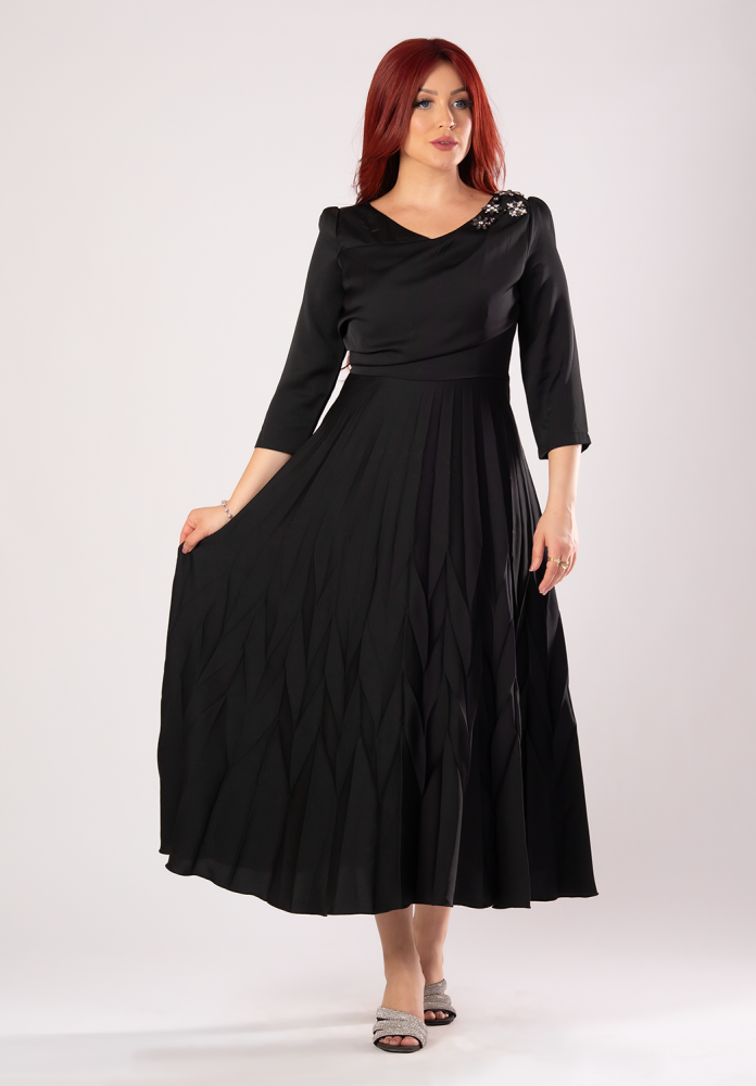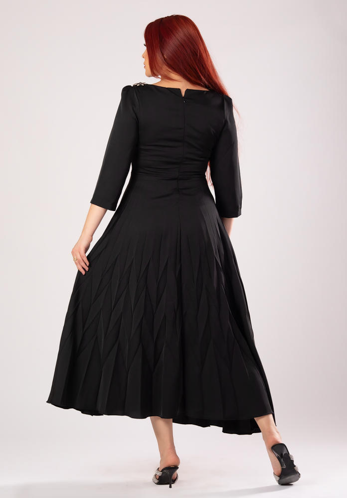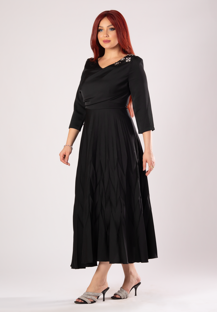 فستان ستان الناعم الطويل بأكمام طويلة و كسرات أنيقة. يتميز هذا الفستان بتصميمه الأنيق وقماشه الفاخر الذي يمنحك شعورًا بالراحة والرفاهية. تضيف الكسرات لمسة من الأنوثة والجاذبية إلى الفستان، بينما الأكمام الطويلة تمنحك تغطية كاملة وتزيد من أناقة الفستان. مثالي لحفلات الزفاف والمناسبات الرسمية وغير الرسمية.
