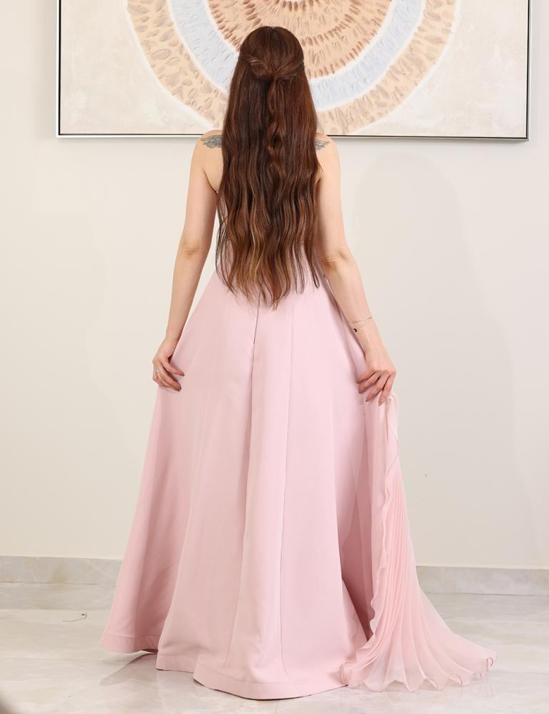 فستان وردي ناعم بتصميم توب وفتحة كلوش، أنوثي وفخم بلمسة ناعمة، يبرز جمالك ويمنحك إطلالة ملكية تلفت الأنظار في كل مناسبة راقية.